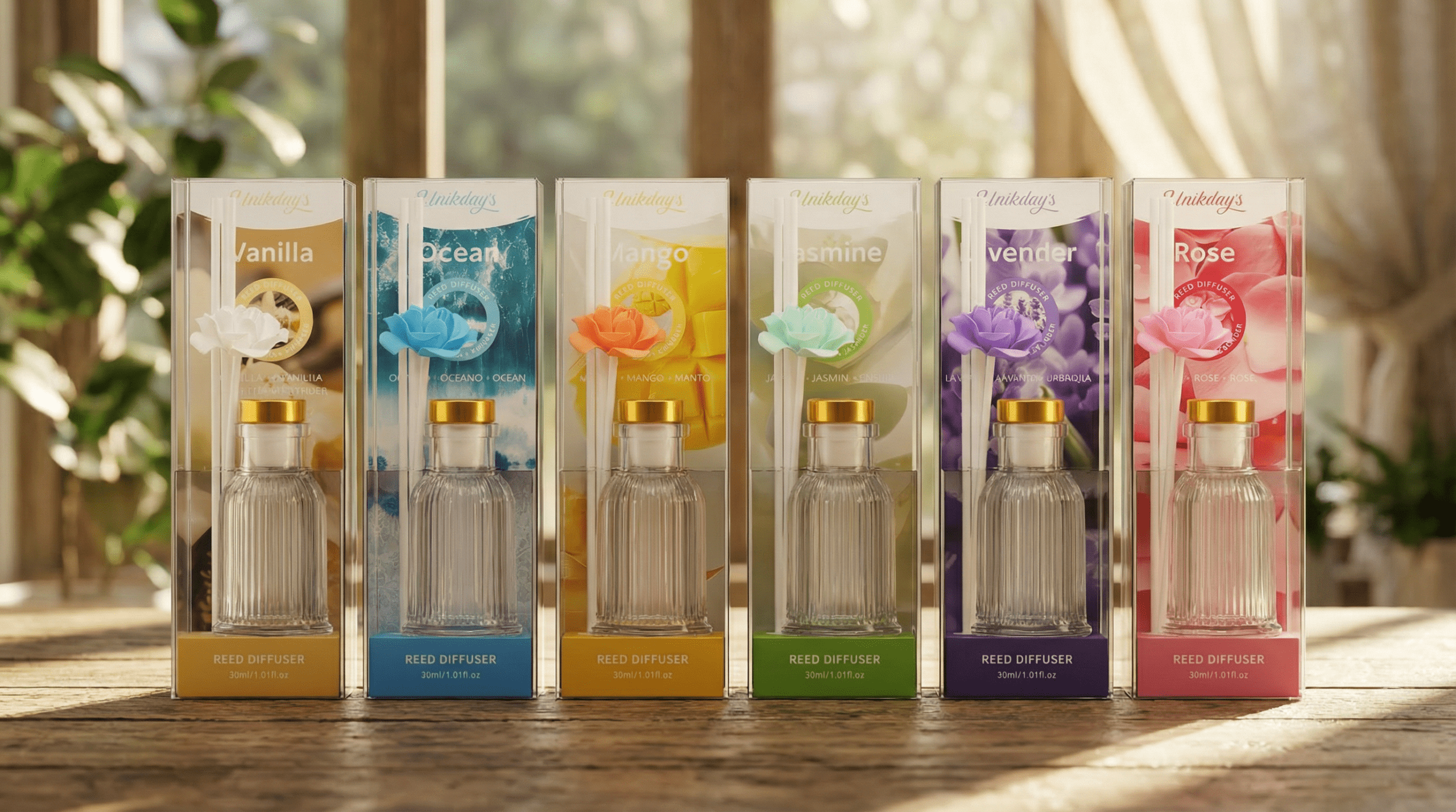 Each 30ml reed diffuser is crafted with a premium glass bottle, paired with clean white reeds and an elegant rose accent, delivering both fragrance and visual charm.